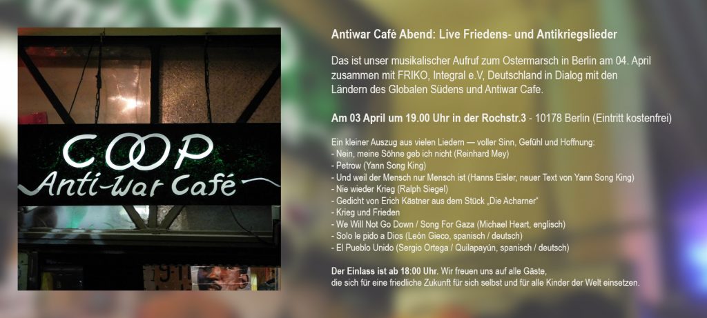 Antiwar Café Abend: Live Friedens- und Antikriegslieder Das ist unser musikalischer Aufruf zum Ostermarsch in Berlin am 04. April zusammen mit FRIKO, Integral e.V, Deutschland in Dialog mit den Ländern…
